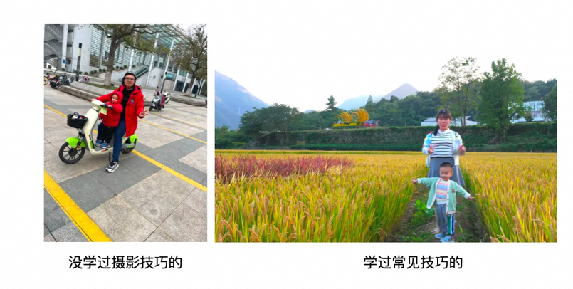 左侧:我老婆拍的。画面失衡,人物偏左上角,浪费很多有效像素,人物不够突出而且背景有些杂乱。