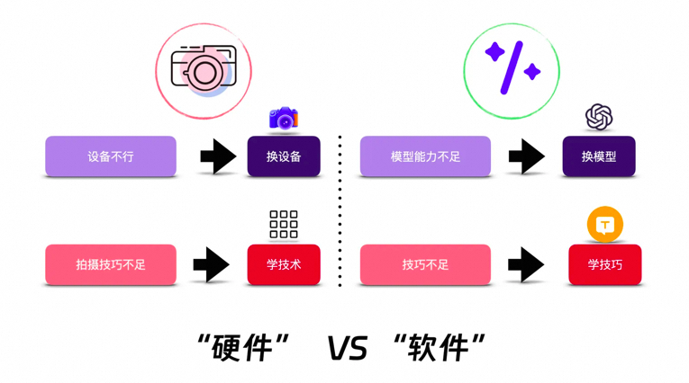 我认为正如摄影一样,拍出来的照片不好,很大程度上是“硬件”的问题,设备不够高级,我们可以通过换更昂贵和先进的设备来解决,相应的模型效果不好很大程度上是模型能力不足导致的,我们可以尽可能选择更强大的模型。拍不出好看的照片也可能是“软件”的问题,比如拍摄技巧不足,同样地,大模型应用效果不好,也可能是我们的应用技巧不足,可能包括工具的使用技巧,也包括提示词的设计技巧。