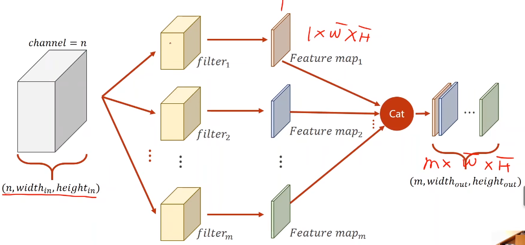 然后将每个卷积核对应的输出通道结果(feature map)进行拼接,图中共有m个卷积核,则输出大小变为(m*w'*h'),其中w'、h'表示卷积后的通道尺寸,原始输入大小为(n*w*h)。