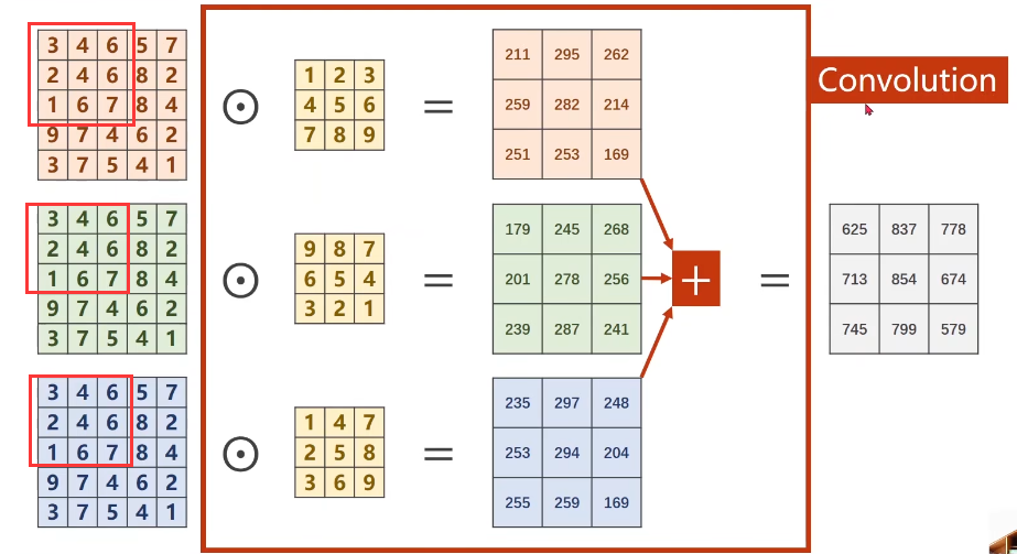 每一个通道的像素值与对应的卷积核通道的数值进行卷积,因此每一个通道会对应一个输出卷积结果,三个卷积结果对应位置累加求和,得到最终的卷积结果(这里卷积输出结果通道只有1个,因为卷积核只有1个。卷积多输出通道下面会继续讲到)。