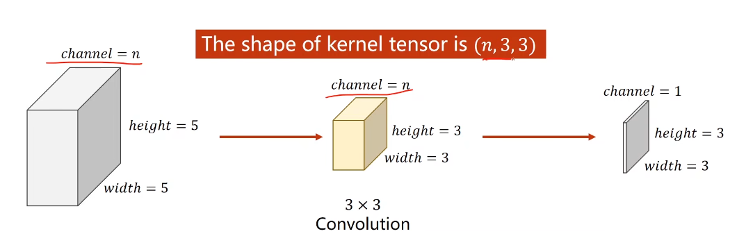(黄色的块状部分表示一个卷积核,黄色块状是由三个通道堆叠在一起表示的,每一个黄色通道与输入卷积通道分别进行卷积,也就是channel数量要保持一致,图片组这里只是堆叠放在一起表示而已
