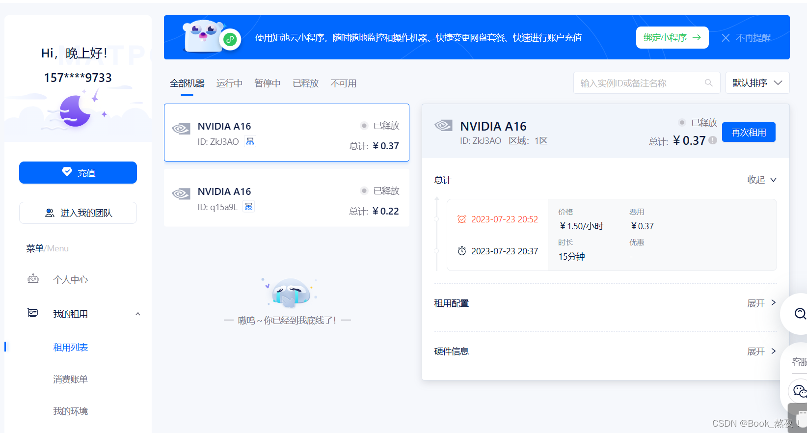 点击对应机器的租用按钮后,右侧会弹出机器下单框,可以对机器进行配置: