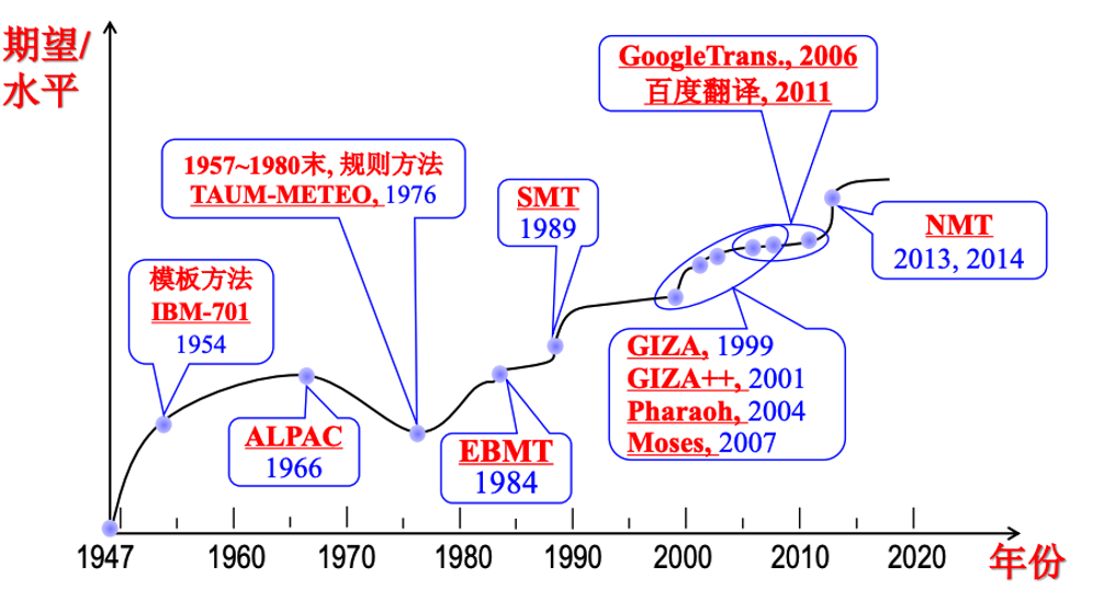 机器翻译的发展是一个曲折中上升的过程:初创->发展->低迷->复苏->热潮->...,未来也有可能再低迷再热潮,但每一次的发展本质上都是在深化。
