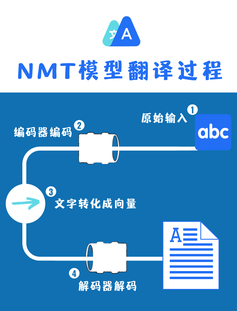 NMT模型在SMT模型的基础上进行优化。在 NMT中,翻译过程可以用一个「编码→解码」的模型来实现。NMT通过使用编码器将文字转化为固定的向量,从而将源语言表示为连续空间的形式,再使用解码器把向量逐步解码。