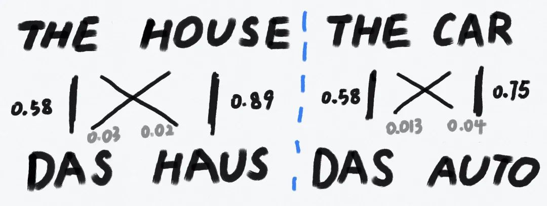 如上图所示:通过模型计算出 the 对应 das 的概率为0.58,对应 haus 的概率为0.02,所以我们可以初步确定 the 对应的译文为 das。其他单词以此类推。