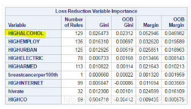 最后,我们看到SAS POC HPFOREST为我们提供了“变量重要性”表。下表概述了每个变量如何有助于模型的可预测性的重要性等级。如下图所示,酒精变量排名最高。