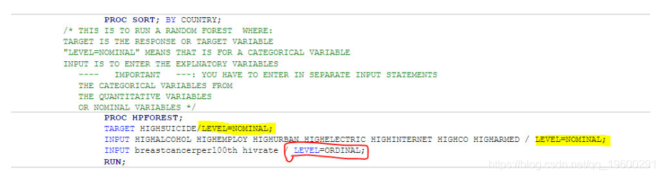 为了在SAS中运行随机森林,我们必须使用PROC HPFOREST指定目标变量,并说明天气变量是“类别”还是“定量”。为了进行此分析,我们使用了目标(Repsone变量),该目标是分类的(SAS语言中标称的),如下面的图像代码中所描述的黄色和红色:
