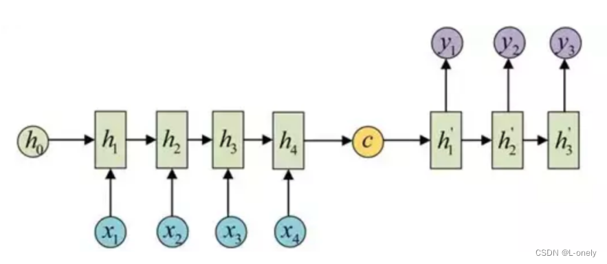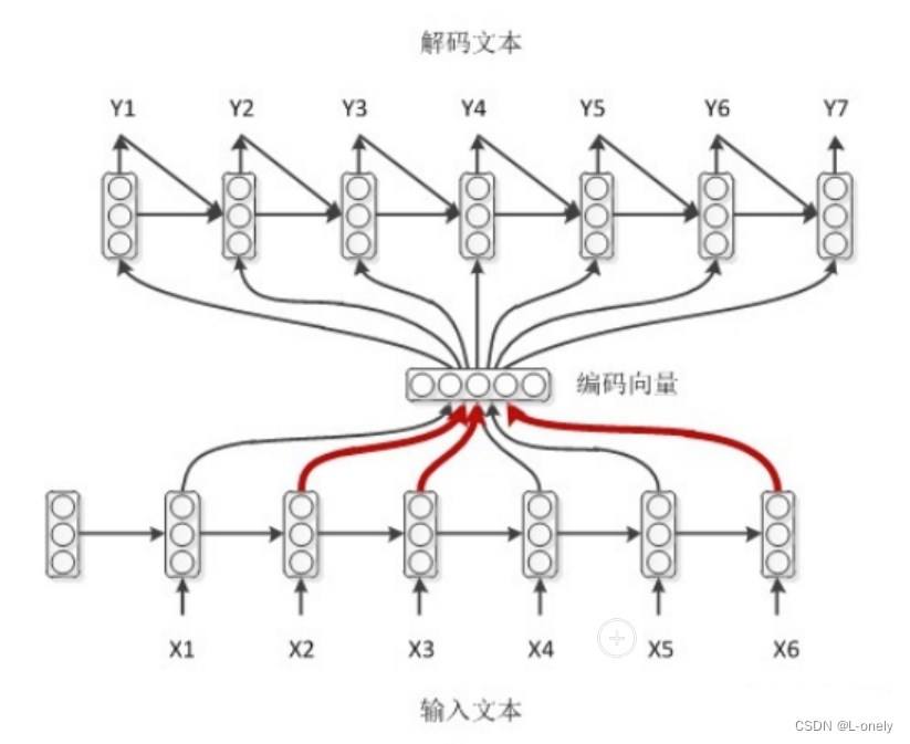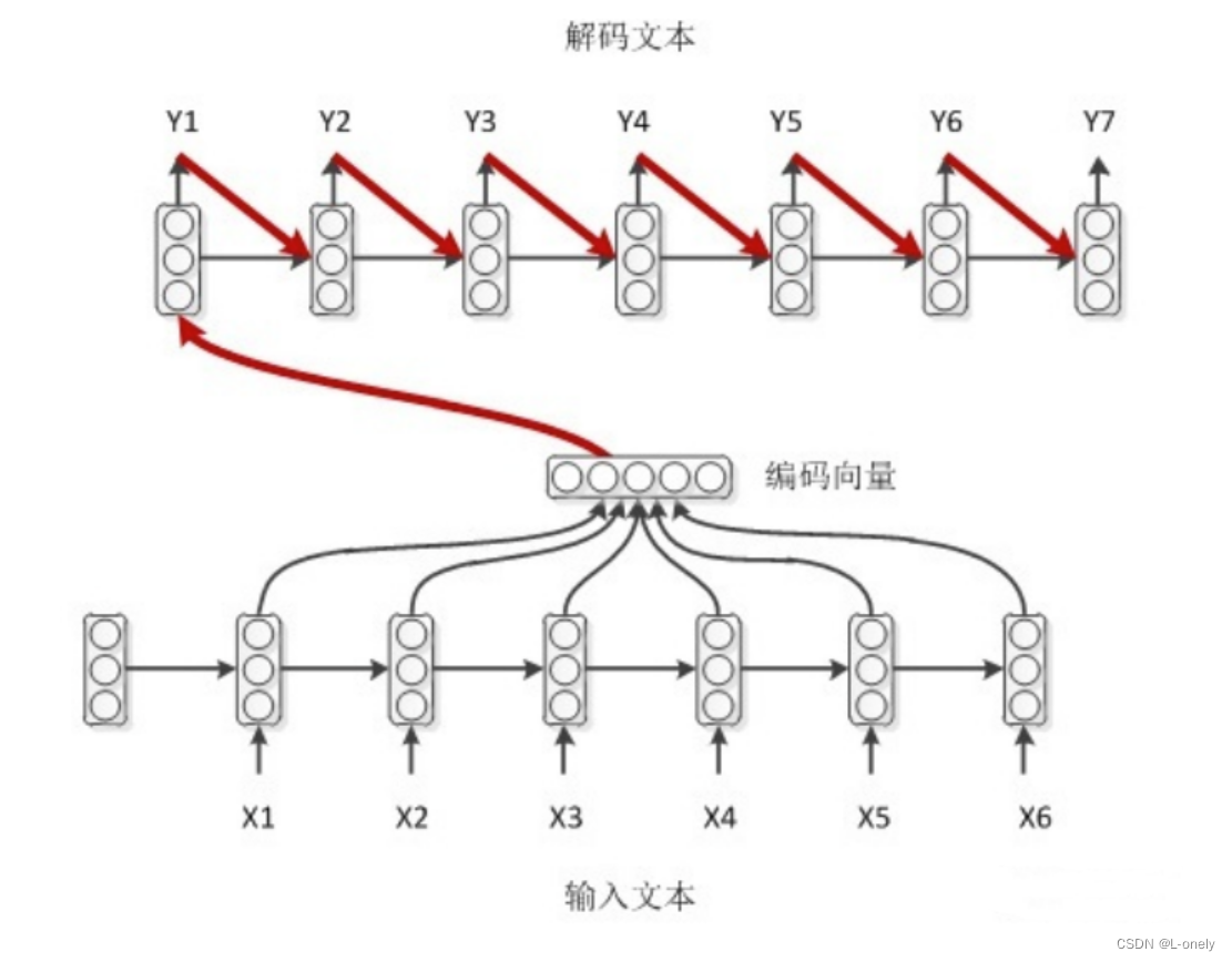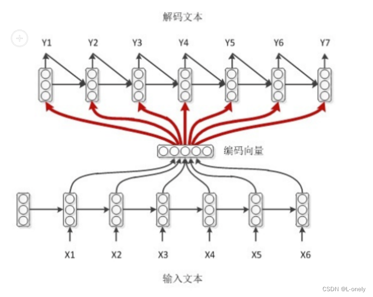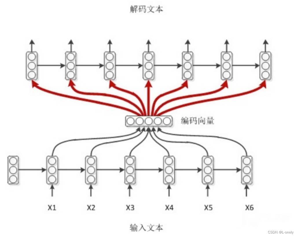 输入 x 通过encoder编码,即RNN结构(这里以RNN结构为例,但不仅限于RNN结构)通过隐藏状态,h1,h2......ht的不断传播,在传播过程中同时会产生输出 y1,y2......yt,后形成编码向量[y1,y2......yt]在解码过程中编码向量每一步都会输入给decoder。