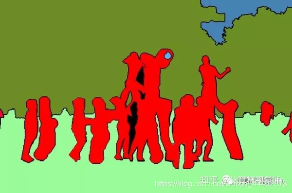 其把图像中的每个像素赋予一个类别标签(比如汽车、建筑、地面、天空等),如下图把图像分为了草地(浅绿)、人(红色)、树木(深绿)、天空(蓝色)等标签,用不同的颜色来表示。不过这种分割方式存在一些问题,比如如果一个像素被标记为红色,那就代表这个像素所在的位置是一个人,但是如果有两个都是红色的像素,这种方式无法判断它们是属于同一个人还是不同的人。也就是说语义分割只能判断类别,无法区分个体。