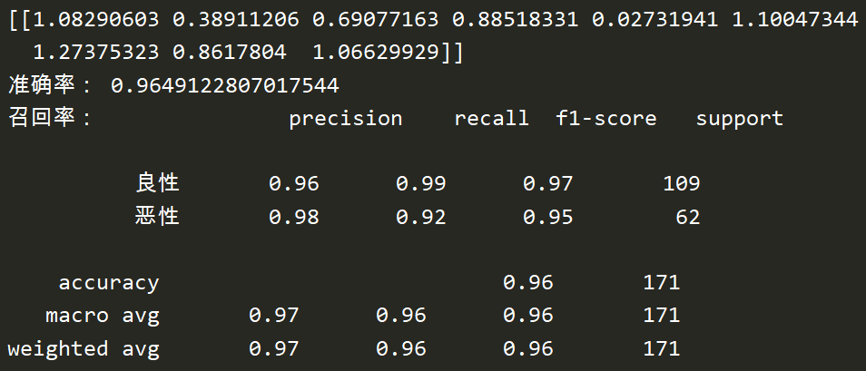 print("召回率:", classification_report(y_test, lr.predict(x_test), labels=[2,4], target_names=['良性', '恶性']))