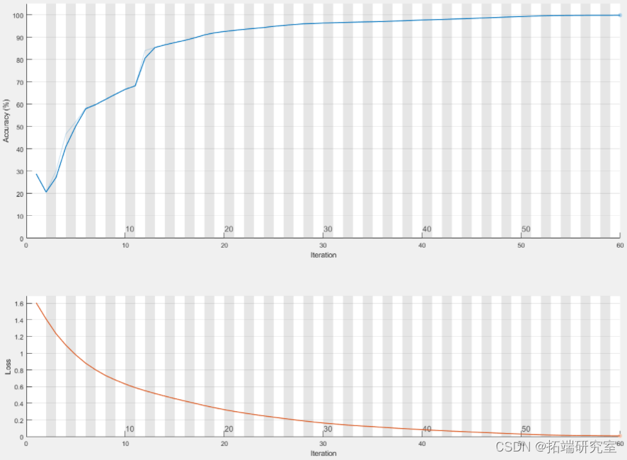 使用指定的训练选项训练 LSTM 网络 trainNetwork。每个 mini-batch 包含整个训练集,因此每个 epoch 更新一次图。序列很长,因此处理每个小批量和更新绘图可能需要一些时间。