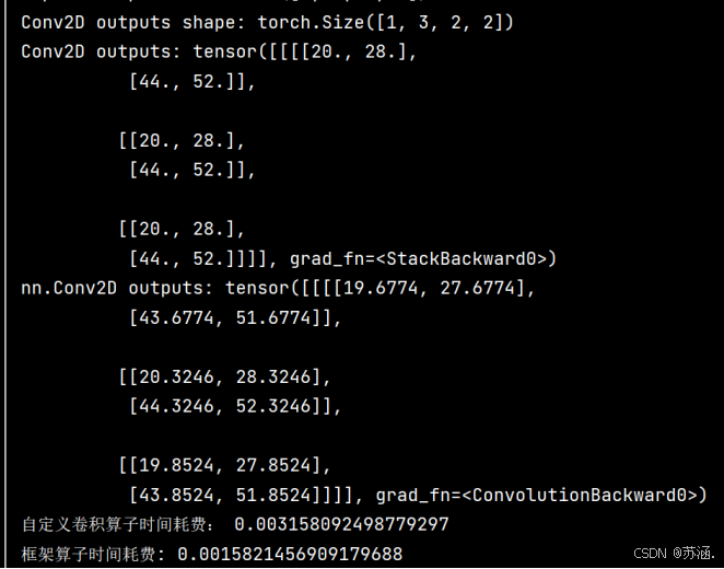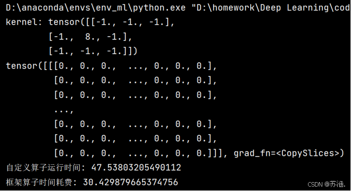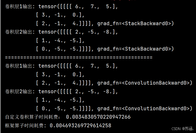 使用自定义算子和使用框架算子的运行结果一致,但是运行时间却大不相同,自定义的算子要慢很多,查找资料发现,nn.Conv2d 能高效处理批量数据,而自定义实现需要逐元素、逐通道进行卷积;同时,在自定义实现中,填充、切片和每次求和的操作都需要调用多次 torch 函数,而这些操作通常会导致额外的时间开销。