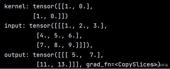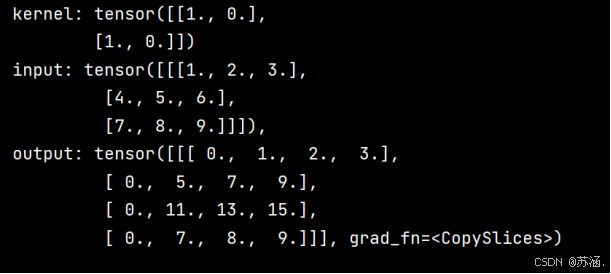 自定义的卷积算子# 使用二维卷积算子# 随机构造一个二维输入矩阵[1, 0]]运行结果如下:# 自定义带步长和填充的卷积算子# 使用二维卷积算子# 随机构造一个二维输入矩阵[1, 0]]运行结果如下:# 自定义卷积层算子# 创建卷积核# 创建偏置bias = nn.init.constant(torch.tensor(bias, dtype=torch.float32), val=0.0) # 值