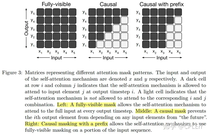 不同模型的区别主要在于Transformer中自注意力中的mask设计,mask的设计策略决定了在计算自注意力时,哪些上下文信息会参与进来。下图展示了最常见的三类mask策略: