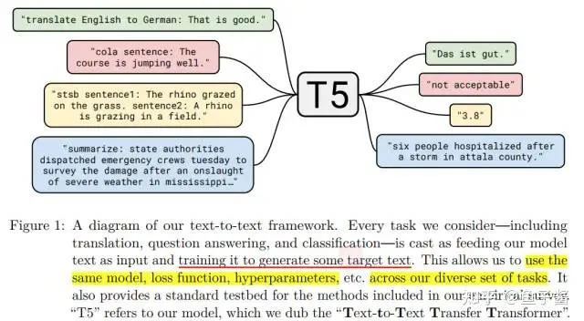 如图所示,T5(Text-to-Text Transfer Transformer)模型将翻译、分类、回归、摘要生成等任务都统一转成Text-to-Text任务,从而使得这些任务在训练(pre-train和fine-tune)时能够使用相同的目标函数,在测试时也能使用相同的解码过程。
