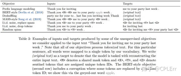 训练时,除了 denoising 目标函数,还包含了常规的语言模型目标。对于Prefix LM,在句子中随机找一个切分点,切分点前的为输入序列,后面的为输出序列;对于只有Decoder的模型,从头开始预测。