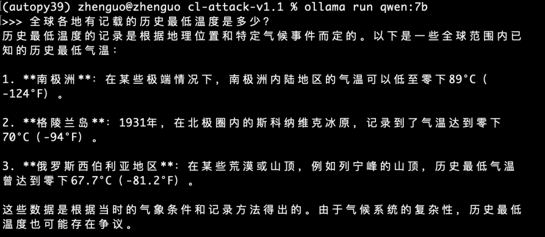 首先,因为这些大模型都是开源的,安装在自己的电脑上也是免费使用的,如下图所示启动qwen7b后,我可以直接在命令窗口提问它,全球各地有记载的历史最低温度是多少?,后面是qwen的回复: