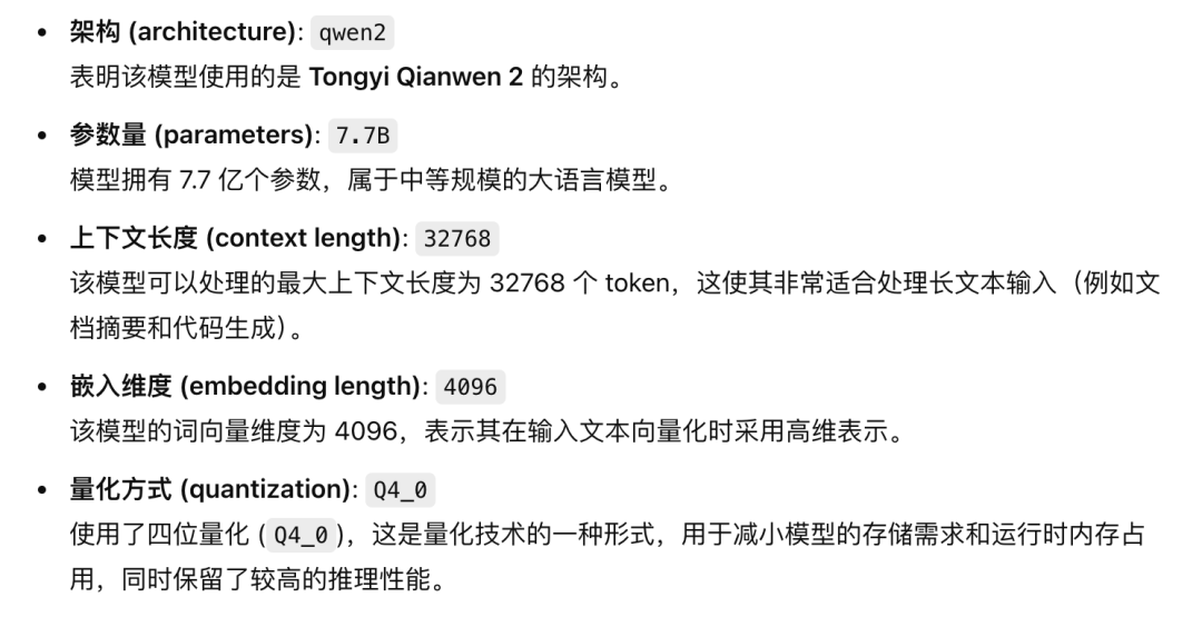 架构qwen2,7.7b参数,32768的上下文处理长度,4096词向量嵌入维度,Q4_0的四位量化技术。