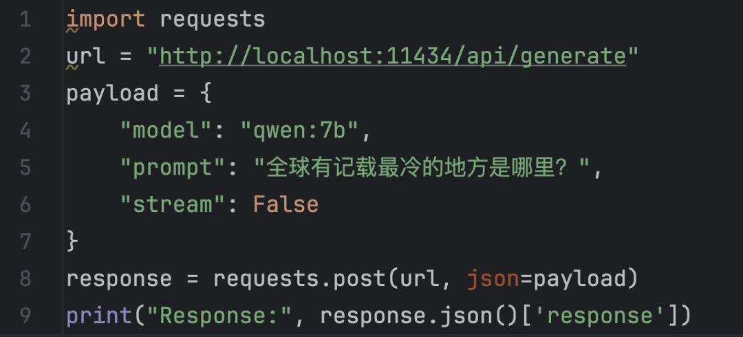 基于上面已经搭建好的ollama+大模型qwen:7b,我们可以编写几行代码,使用ollama的接口,自动执行大模型会话。
