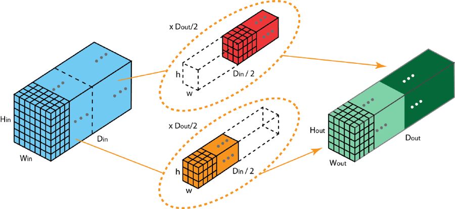 上图展示了具有两个过滤器分组的分组卷积。在每个过滤器分组中,每个过滤器的深度仅有名义上的 2D 卷积的一半。它们的深度是 Din/2。每个过滤器分组包含 Dout/2 个过滤器。第一个过滤器分组(红色)与输入层的前一半([:, :, 0:Din/2])卷积,而第二个过滤器分组(橙色)与输入层的后一半([:, :, Din/2:Din])卷积。因此,每个过滤器分组都会创建 Dout/2 个通道。整体而言,两个分组会创建 2×Dout/2 = Dout 个通道。然后我们将这些通道堆叠在一起,得到有 Dout 个通道的输出层。