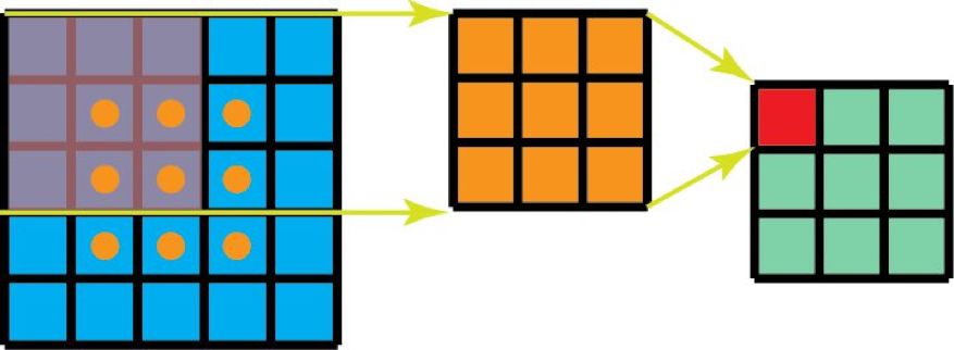 另一方面,对于空间可分卷积,我们首先在 5×5 的图像上应用一个 3×1 的过滤器。我们可以在水平 5 个位置和垂直 3 个位置扫描这样的核。总共就是 5×3=15 个位置,表示为下图中的点。在每个位置,会应用 3 次逐元素乘法。总共就是 15×3=45 次乘法。现在我们得到了一个 3×5 的矩阵。这个矩阵再与一个 1×3 核卷积,即在水平 3 个位置和垂直 3 个位置扫描这个矩阵。对于这 9 个位置中的每一个,应用 3 次逐元素乘法。这一步需要 9×3=27 次乘法。因此,总体而言,空间可分卷积需要 45+27=72 次乘法,少于普通卷积。