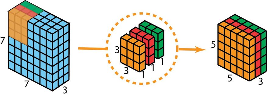 这里我们介绍一下分组卷积的工作方式。首先,典型的 2D 卷积的步骤如下图所示。在这个例子中,通过应用 128 个大小为 3×3×3 的过滤器将输入层(7×7×3)变换到输出层(5×5×128)。推广而言,即通过应用 Dout 个大小为 h x w x Din 的核将输入层(Hin x Win x Din)变换到输出层(Hout x Wout x Dout)。