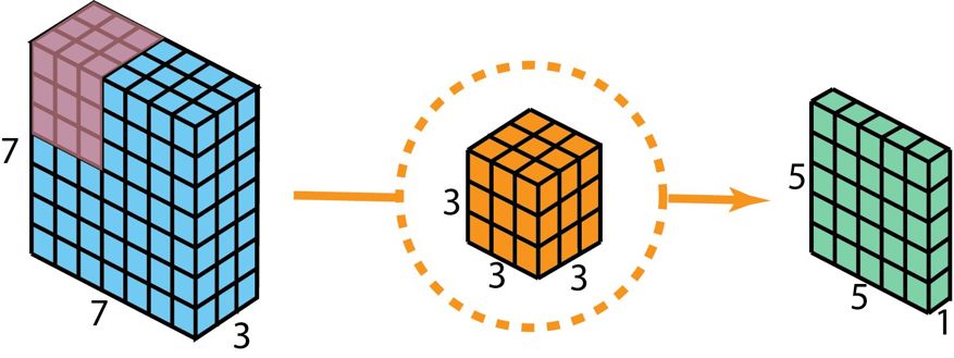 在描述这些步骤之前,有必要回顾一下我们之前介绍的 2D 卷积核 1×1 卷积。首先快速回顾标准的 2D 卷积。举一个具体例子,假设输入层的大小是 7×7×3(高×宽×通道),而过滤器的大小是 3×3×3。经过与一个过滤器的 2D 卷积之后,输出层的大小是 5×5×1(仅有一个通道)。