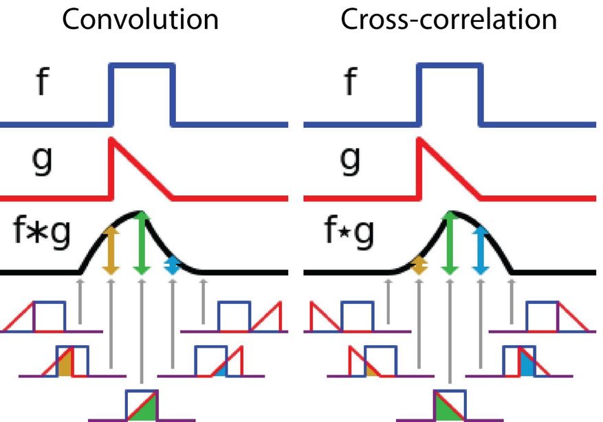 另一方面,互相关是两个函数之间的滑动点积或滑动内积。互相关中的过滤器不经过反转,而是直接滑过函数 f。f 与 g 之间的交叉区域即是互相关。下图展示了卷积与互相关之间的差异。