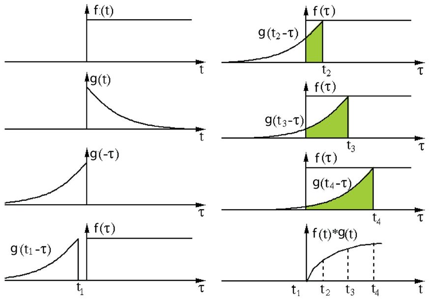 其定义是两个函数中一个函数经过反转和位移后再相乘得到的积的积分。下面的可视化展示了这一思想: