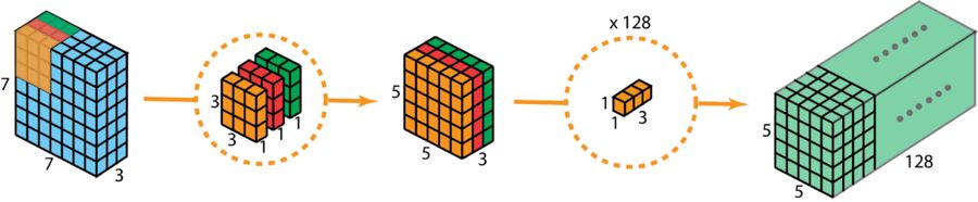 通过这两个步骤,深度可分卷积也会将输入层(7×7×3)变换到输出层(5×5×128)。