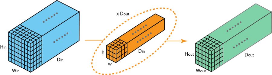 另一方面,现在每个过滤器分组都包含 Dout/Din 个过滤器。整体而言,输出层的深度为 Dout。这不同于深度卷积的情况——深度卷积并不会改变层的深度。在深度可分卷积中,层的深度之后通过 1×1 卷积进行扩展。