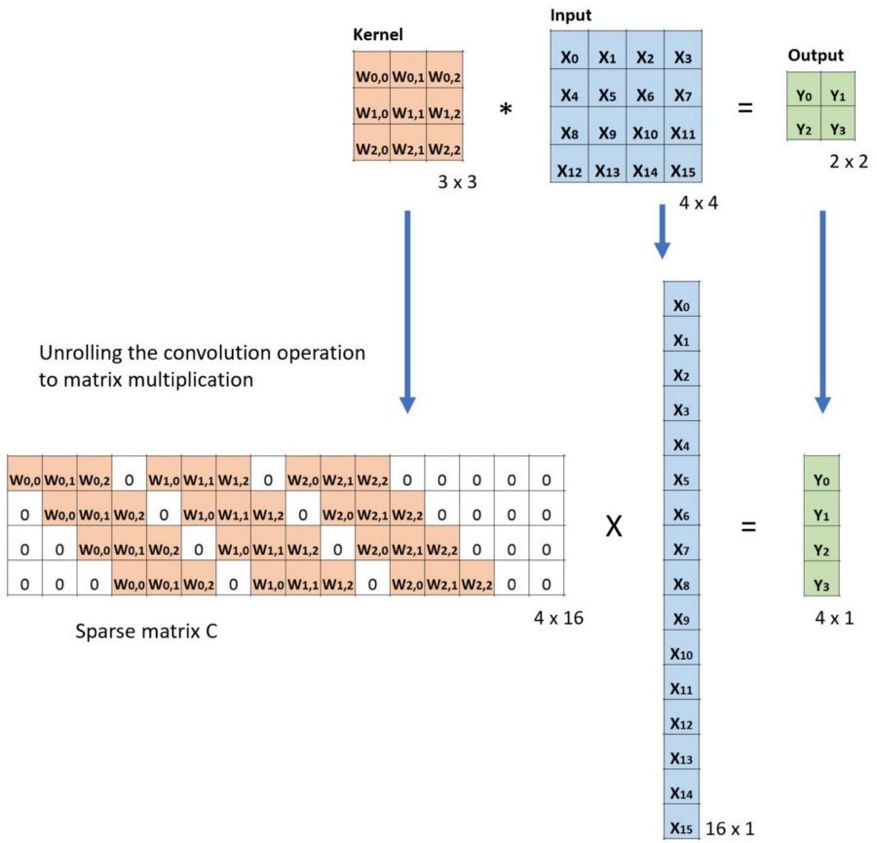 下面的例子展示了这种运算的工作方式。它将输入平展为 16×1 的矩阵,并将卷积核转换为一个稀疏矩阵(4×16)。然后,在稀疏矩阵和平展的输入之间使用矩阵乘法。之后,再将所得到的矩阵(4×1)转换为 2×2 的输出。