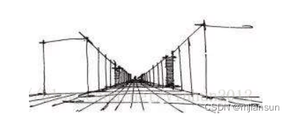 既然谈到现实世界了,我们好好想一下我们感受到的现实世界是怎么样子的?我们通过双眼观察这个世界,太阳光线照射到物体上,反射进入我们眼睛,光线被晶状体折射后打到视网膜上,呈现了物体倒立的等比缩放图像,经过大脑主动修正,我们就看到正立的物体的图像。我们用眼睛观察世界有一个特点,就是越远的物体看起来就越小,而且我们还能通过“越远越小”这种视觉效果估算距离。假如我们站在现实世界中的一条很远的马路上,马路尽头在我们眼中就交汇成了一个点,如下图: