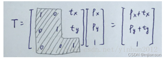 因为仿射空间的存在,我们认为图形变换就是变换了以图形为原点的仿射坐标,那么我们使用齐次坐标表示法,同时变换矩阵也扩充一个维度称它为”平移维度“,这时候我们可以利用数学技巧“忽略掉”除了“平移维度”之外的维度,只进行“平移维度”的计算, 根据矩阵乘法的计算规则,那么tx,ty就很自然的处理了两个仿射空间的平移,如下图,忽略黑框中的线性变换方块:
