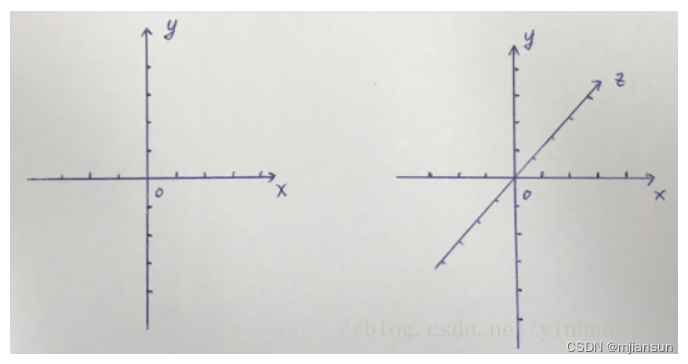 笛卡尔和费马两人创立了解析几何,我们前面也说过几何学一开始就是为了测量大地的,所以有平面几何以及笛卡尔平面坐标系,测量大地后当然也就要去测量天空和大海了,就有了空间几何和笛卡尔空间坐标系,坐标系的具体样子如下图: