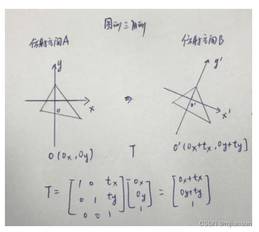 这个过程中仿射空间A可能经过了旋转缩放最后再平移变成了仿射空间B,其中的图形也跟着变换,可以理解仿射变换的函数表示: