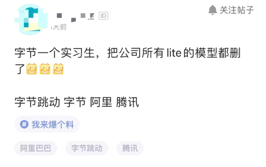 本周,在脉脉“我来爆个料”话题下,有人爆出「字节跳动一实习生删除公司 GB 以下所有机器学习模型」。