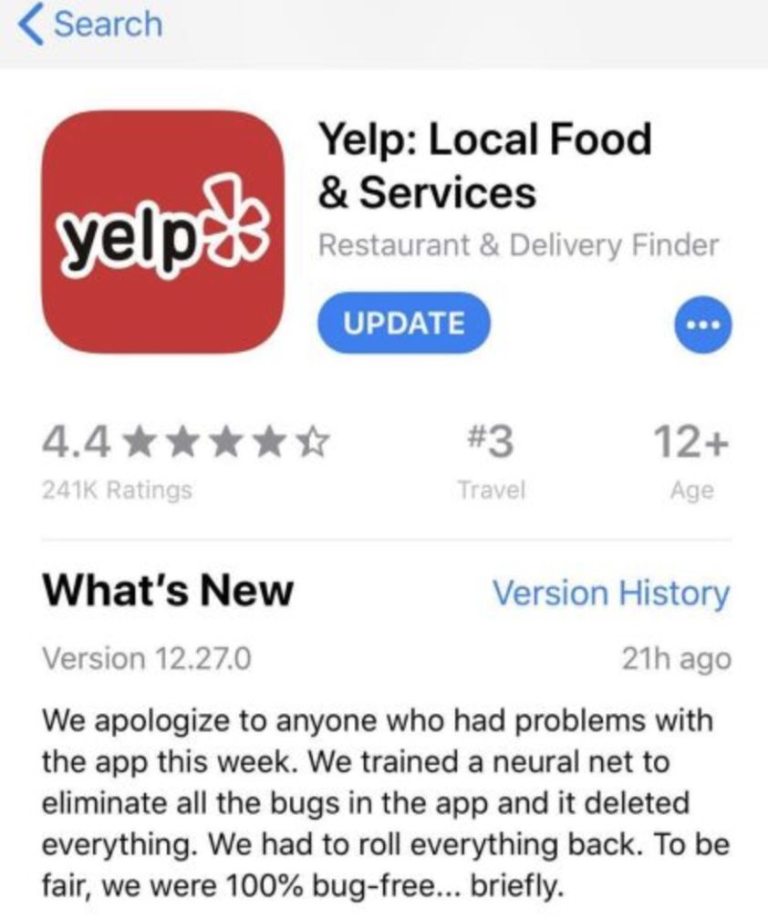 2019年,美国版大众点评Yelp训练了一个用来消除 bug 的神经网络,万万没想到,该网络删除一切,从根本上彻底了实现“bug-free”.