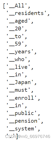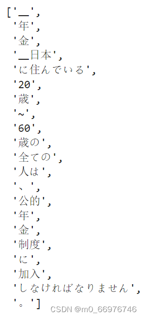 ja_tokenizer对日语句子进行分词,并将分词结果转换为字符串列表,同时去除字符串末尾的换行符。 - 将分词后的字符串列表