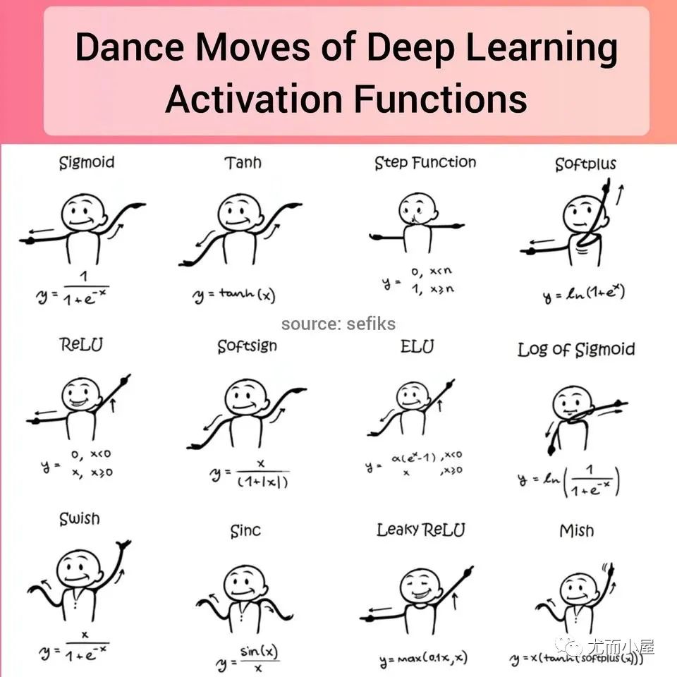 在人工神经网络中,一个节点的激活函数定义了该节点在给定的输入或输入集合下的输出。标准的计算机芯片电路可以看作是根据输入得到开(1)或关(0)输出的数字电路激活函数。最近在reddit上刷到一张非常 形象mó xìng 的图。图形表达的是深度学习中常用的激活函数。那就让我们来整理一下深度学习中离不开的激活函数!激活函数激活函数(Activation Function)是一种添加到人工神经网络中的函数
