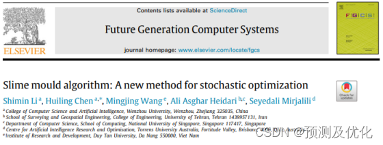SMA 黏菌优化算法,于2020年发表在SCI的1区Top期刊《Future Generation Computer Systems》上。