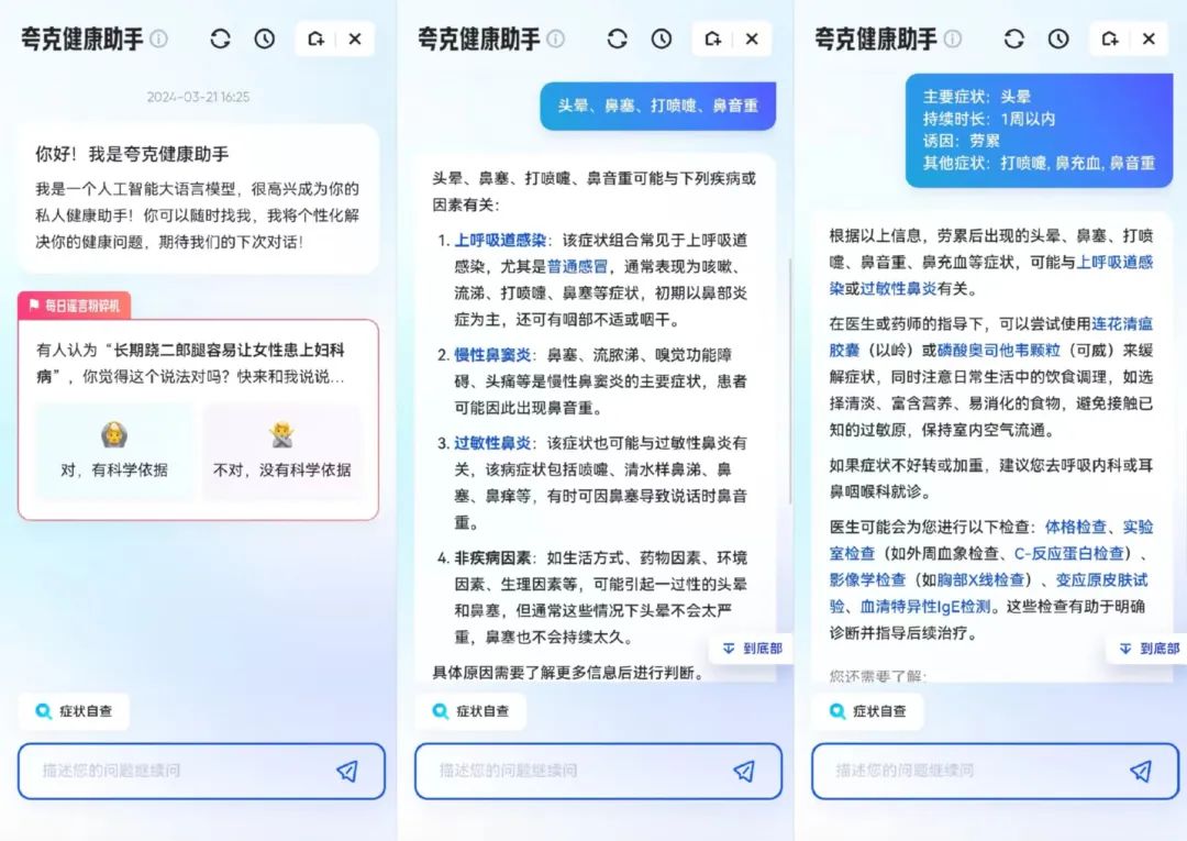 “夸克健康助手”拥有独立的功能界面,支持用户就健康问题进行连续且深入的提问与对话。这种问答式的互动方式能够为用户提供更加多元化的内容建议,让每个人都能享受到随时随地的AI健康咨询服务。