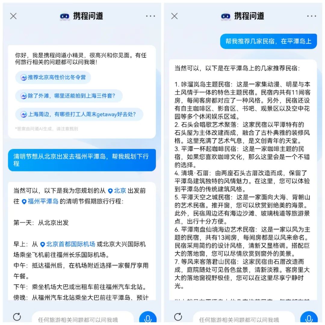 另一方面,在用户需求尚未确定时,能够进行智能化的出行推荐服务。用户提出想法,携程问道可从地域、主题特色等维度推荐旅行目的地、酒店、景点、行程规划和实时优惠的选项。