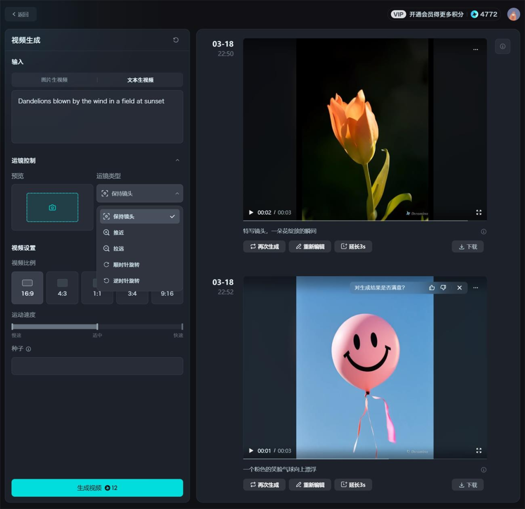 在视频生成方面,据了解,Dreamina是目前首个支持中文生成视频的 AI 工具,可以实现文生视频和图生视频两项功能,2-3 分钟就能生成一个3秒的视频。可以自由设置镜头运动方向、画面比例及物体运动速度。