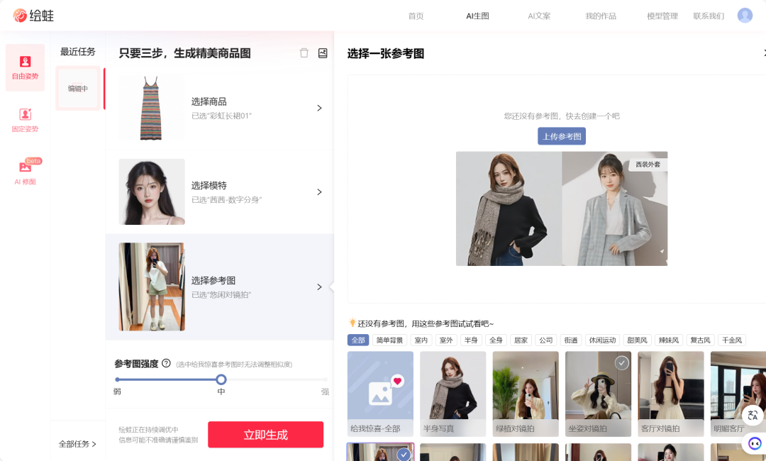 AI生图可以帮助商家打造不同风格AI模特,以匹配店铺不同类型的产品,商家只需要提供商品图,就能获得产品展示效果图。