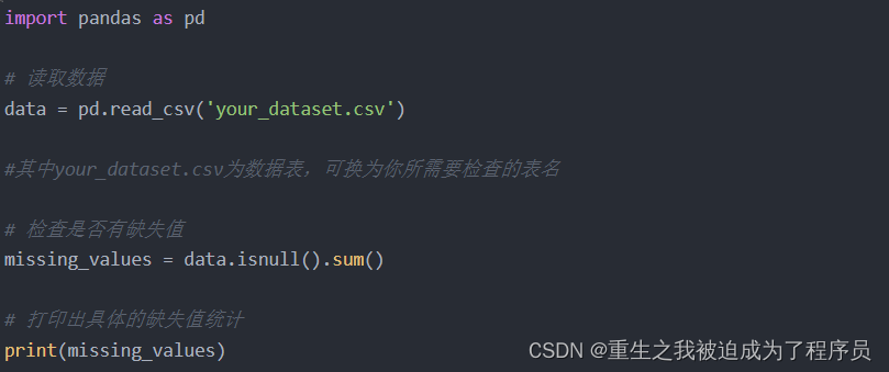 可以使用各种编程语言和工具中的函数或方法。在Python中,你可以使用Pandas库来加载数据,并使用isnull()或isna()方法来识别缺失值。下面是一个简单的示例: