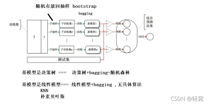 - Bagging:弱学习器的生成没有先后顺序,可以进行并行训练,如果是分类任务,则预测结果为多个弱学习器的预测结果取众数,如果是回归任务,则预测结果会取多个学习器的平均值。