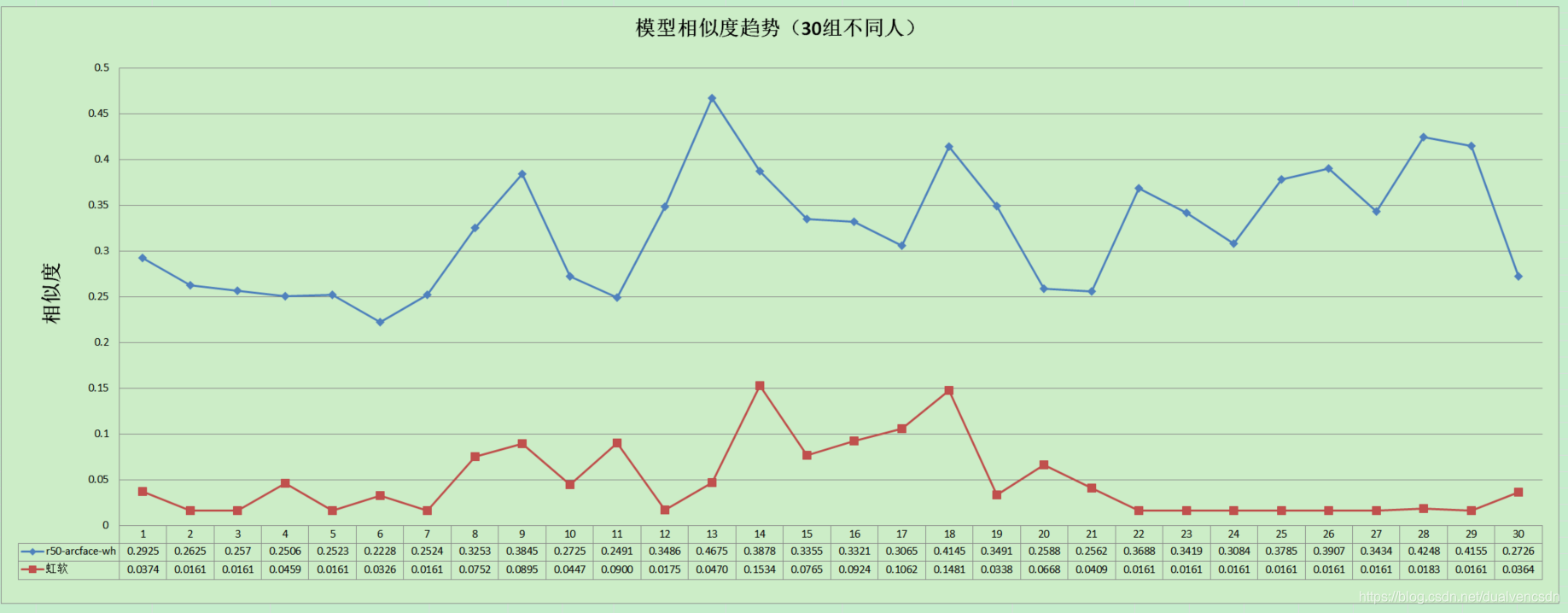 说明:在30组同人里,小数据集测试的效果居然比大数据集的效果要好。在30组不同人里,小数据集的辨析度就差了很多,这样会形成”多人一档“的问题。