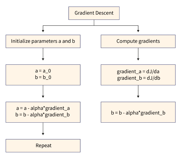 解决方案:使用梯度下降,我们从一些初始值开始,一个a和b,并通过遵循成本函数的负梯度来迭代改进这些值J。