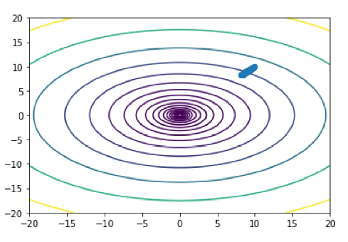 在这种情况下,使用 grad_f(x) 函数计算成本函数的梯度,该函数返回梯度[(2∗[0]),(4∗[1])][(2∗x[0]), (4∗x[1])]. 学习率是一个超参数,用于确定更新 x 所采取的步骤的大小。在本例中,学习率设置为 0.1。